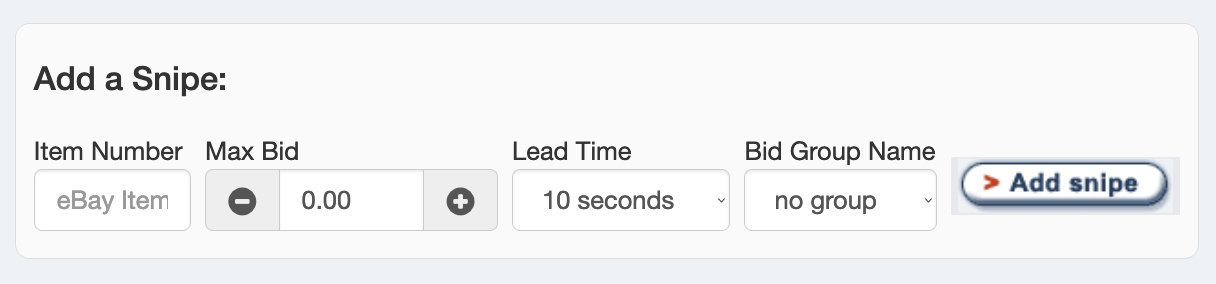 There are several ways to add a snipe. A snipe requires two things: An item number and a bid amount. Here are different ways to retrieve the item number.